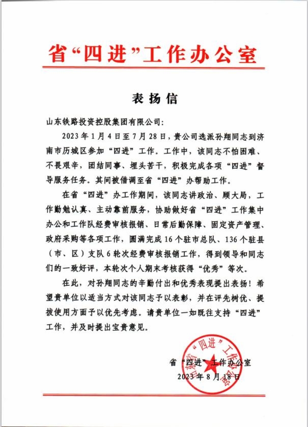 8月18日,集團收到了來自省“四進”工作辦公室發(fā)來的表揚信,集團選派參加歷城區(qū)“四進”工作的支隊成員孫翔同志,獲得省“四進”工作隊期末考核“優(yōu)秀”等次。