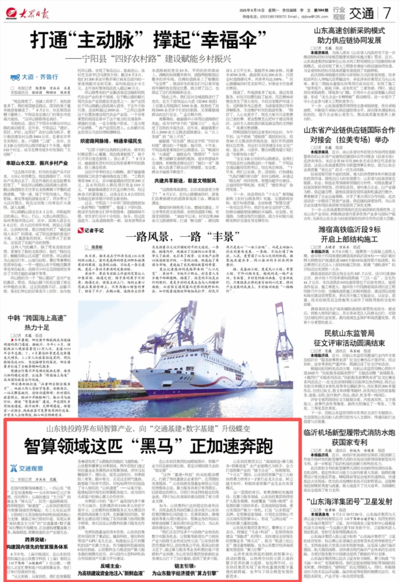 9月15日,《大眾日報(bào)》7版交通版刊發(fā)《山東鐵投跨界布局智算產(chǎn)業(yè),向“交通基建+數(shù)字基建”升級蝶變——智算領(lǐng)域這匹“黑馬”正加速奔跑》,專題報(bào)道山東鐵投集團(tuán)智算業(yè)務(wù)發(fā)展情況。以下是《大眾日報(bào)》原文。