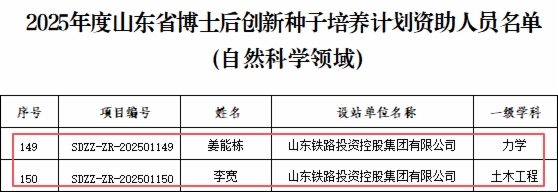 近日,山東省人力資源和社會(huì)保障廳公布2025年度山東省博士后創(chuàng)新種子培養(yǎng)計(jì)劃入選名單,山東鐵投集團(tuán)博士后姜能棟、李寬成功入選,這是集團(tuán)在高層次創(chuàng)新人才培養(yǎng)方面取得的又一重要突破。