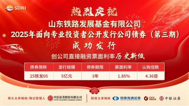 近日,山東鐵投集團權屬山東鐵路發(fā)展基金有限公司(以下簡稱基金公司)成功發(fā)行5億元公司債券,3年期票面利率低至1.85%,認購倍數(shù)達4.36倍,創(chuàng)公司直接融資票面利率歷史新低。本期債券成功發(fā)行,有利于降低鐵路發(fā)展基金整體融資成本,持續(xù)賦能未來業(yè)務發(fā)展。